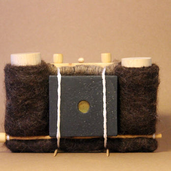 I have made cameras from both recycled and locally sourced materials (Føroyar), A pinhole camera which I made in the Faroe islands during a 1 month residency on the islands in 2016. The camera is made using the materials and skills available on the islands. This project was a collaboration with local craftspeople who I approached with the idea and asked if they would be willing to make a part. Silvursnid made me the brass pinhole, Guðrið Poulsen made the stoneware box and Joel Cole helped me make the winders. The body is felted from Faroese sheep's wool.